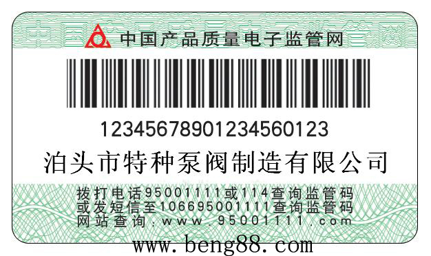 泊頭市特種泵閥制造有限公司自2008年5 月1 日出廠的產(chǎn)品,在產(chǎn)品合格證上粘貼長方形監(jiān)管碼標簽,上有20位數(shù)字,這就是產(chǎn)品監(jiān)管碼。因此,我公司生產(chǎn)的每件產(chǎn)品都將有一個“電子身份證”。可以利用固定電話、手機短信、互聯(lián)網(wǎng)、超市終端等網(wǎng)絡通訊設備對電子監(jiān)管碼進行查詢,辨別真?zhèn)巍2樵冝k法如下: